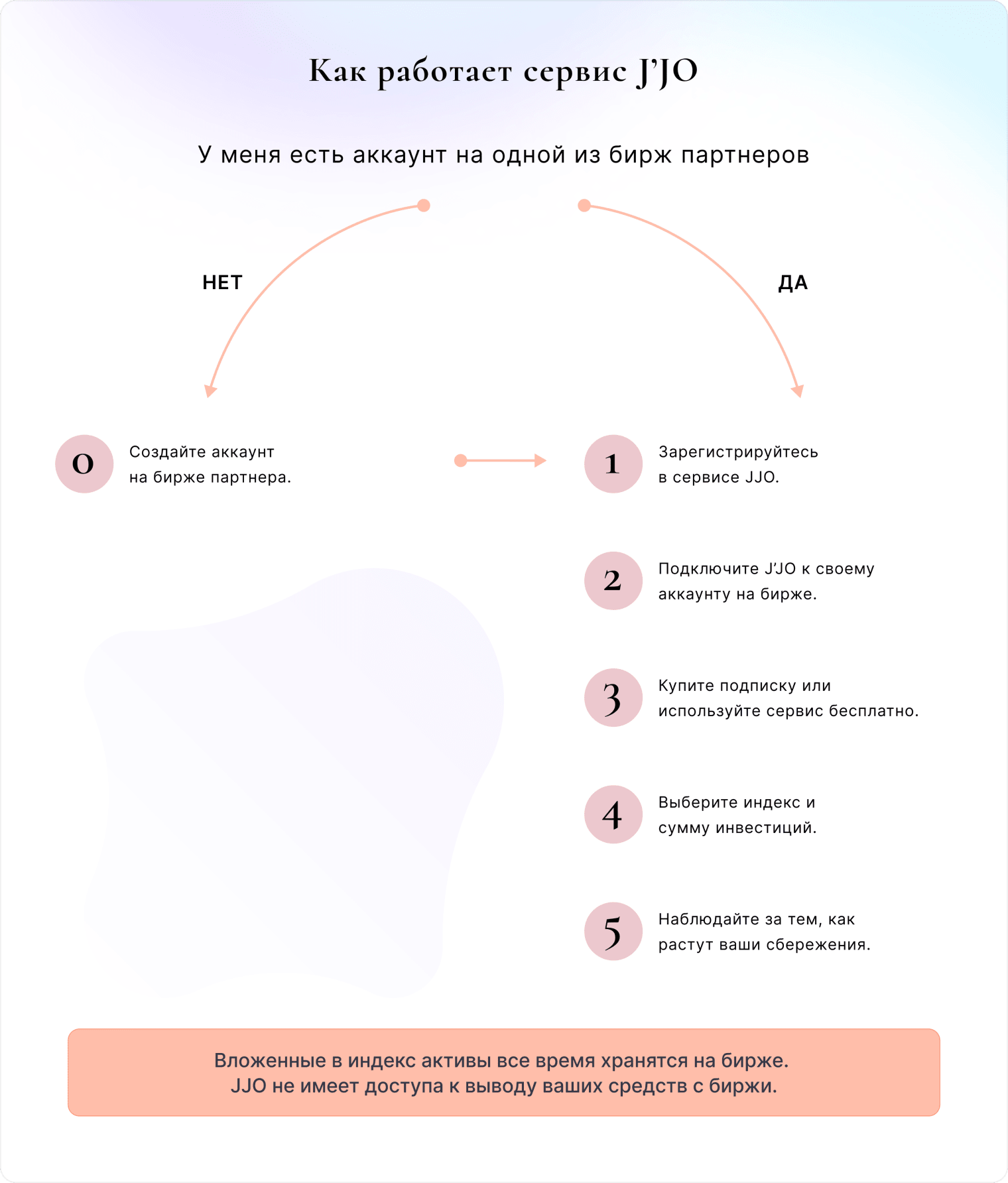 - Полный контроль над сбережениями в ваших руках. Вложенные в индекс активы все время хранятся на вашем биржевом аккаунте. J'JO не имеет технической возможности к выводу ваших средств.