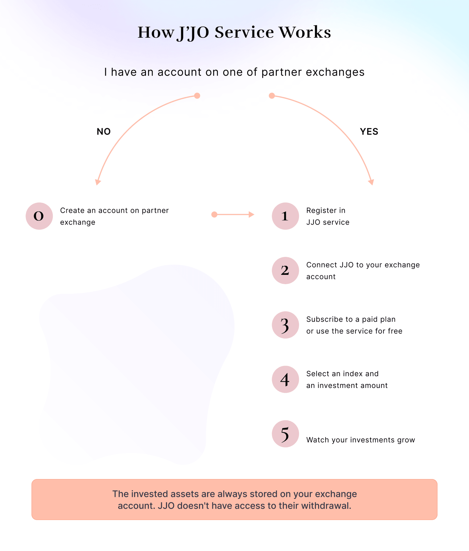 Full control over your savings in your hands. The assets invested in the index are kept in your exchange at all times. J'JO has no technical ability to withdraw your funds.